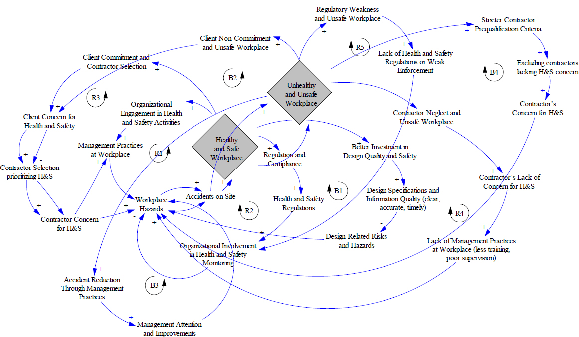 A holistic causal loop diagram of all the variables in a healthy and safe workplace.