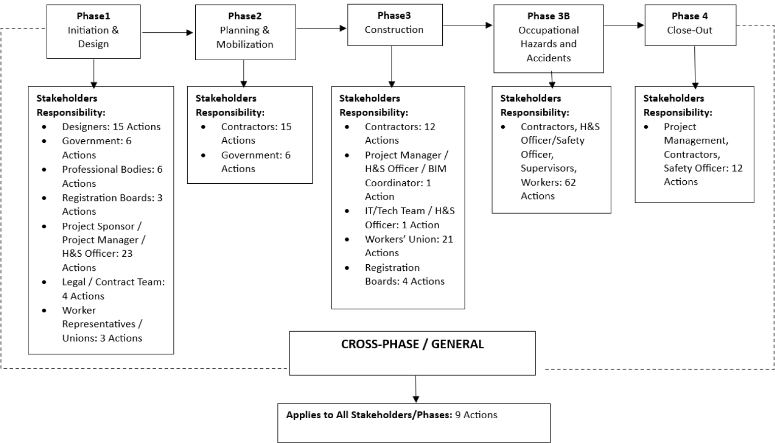 The objectives of the developed actions for Phase 3 and Phase 3B Construction, Occupational Hazards and Accidents are as follows: mandate explicit mitigation strategies (suppression, barriers) and compliance with specific environmental rules (waste disposal), which is a higher standard than the current norm; introduce Key Performance Indicators (KPIs) and routine internal audits, systematizing accountability and follow-up far beyond the required external committee checks; mandate specific, preventative protocols (storage, labeling, lifting gear) and ergonomic training; add rigor to routine cleaning schedules and explicit hygiene regulations; converse to digital, real-time, cloud-based, and BIM integrated safety documentation, enabling a significant upgrade in the ease of use and access compared to handling paper files; introduce advanced, real-time safety technology (AI, drones, wearables) for continuous monitoring; introduce a Permit-To-Work system for high-risk works; mandate certification for operators and detailed daily checklists; set a high-er standard for the safe operation and maintenance of machinery; mandate specific engineering controls (GFCIs, grounding) and strict labeling protocols for electrical safety, which is more rigorous than general injury prevention; systematize detection systems, daily controls and tailored training for all workers; implement site-level control (signposted paths, marshals) to direct internal traffic; mandate structured procedures (e.g., specific scaffolding permits, rescue plans, detailed trench shoring) for these high-risk activities; mandate specific engineering controls (100% tie-off, permanent noise monitors, ventilation, chemical substitution) and continuous, advanced training (VR/Simulators) for all workers and HSE induction for visitors, elevating the overall training culture; and implement explicit DEI (Diversity, Equity and Inclusion) requirements and physical provisions.